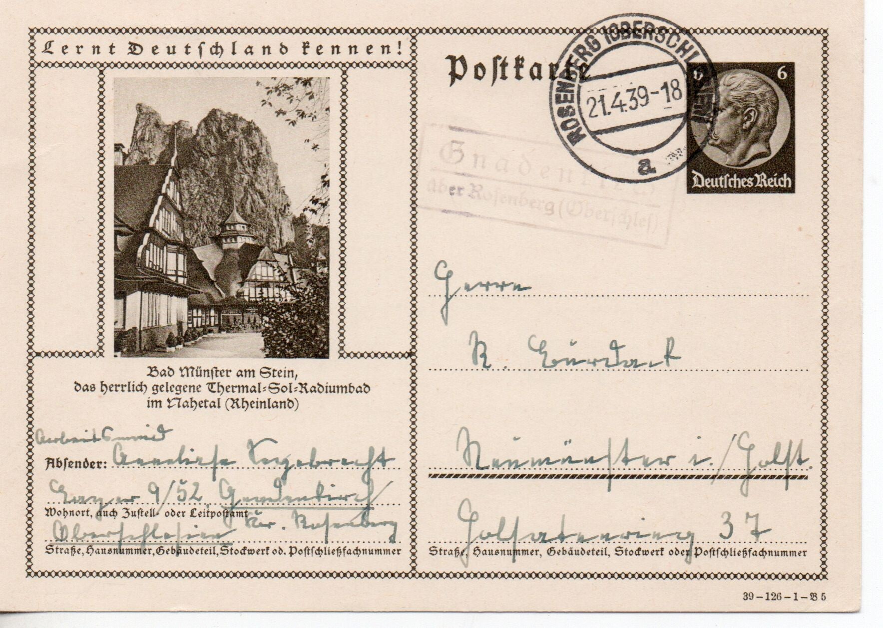 gest. Rosenberg 21.4.39 mit Bahnpost